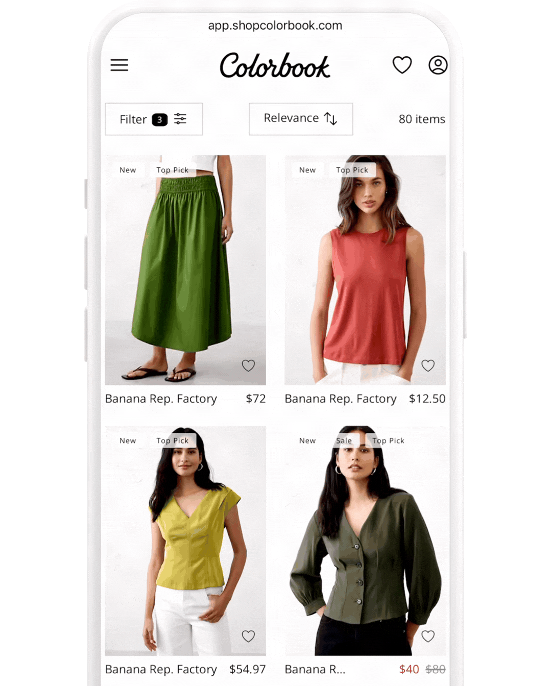 A Colorbook membership ($9.99/month) gives you full access to the shop: thousands of in-stock pieces, thoughtfully curated by season, with filters for size, brand, price, and more — so you can shop confidently, in real time.